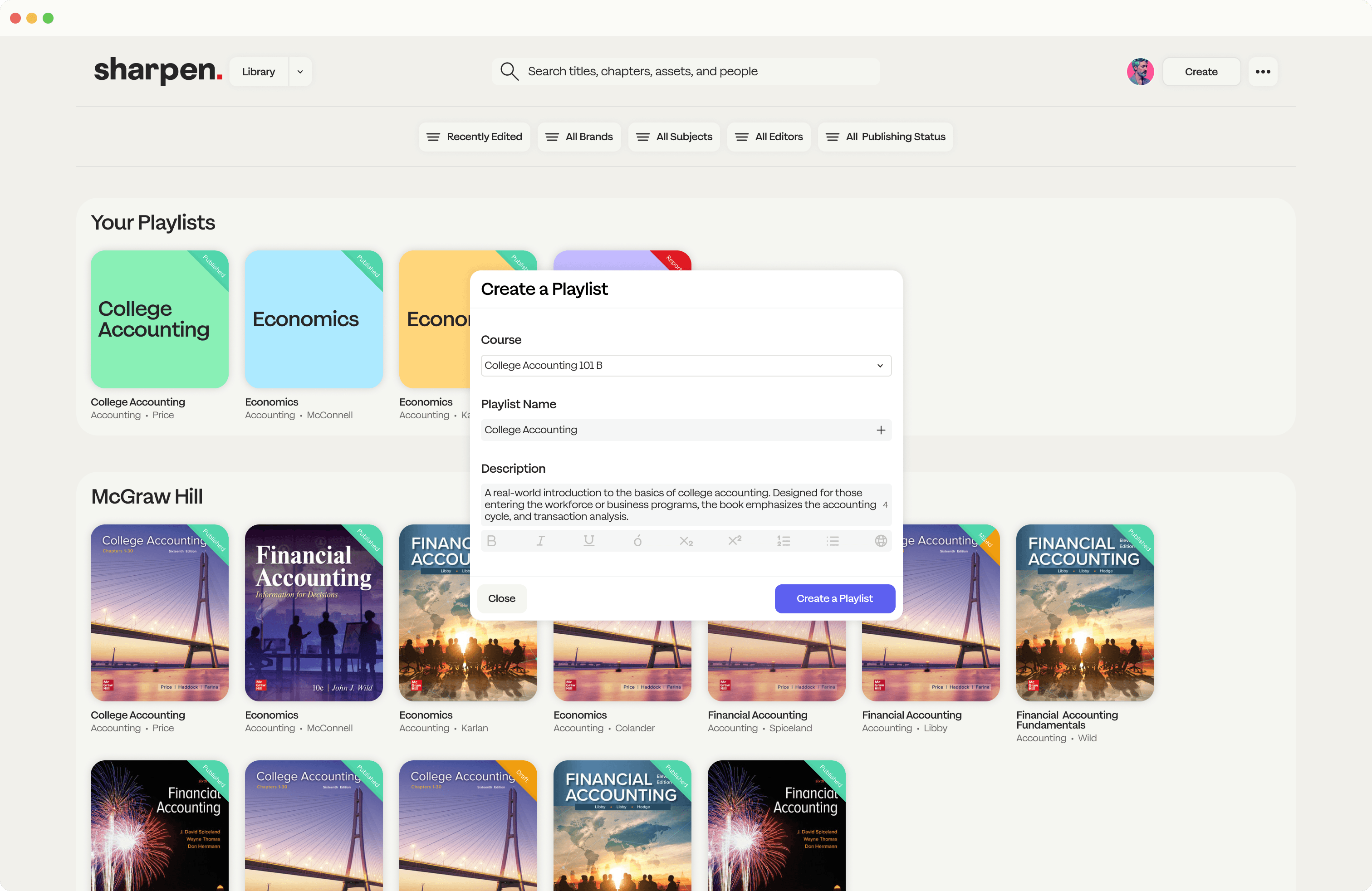Access your AI-enabled dashboard, upload institution- and course-specific resources, and create custom playlists for students.